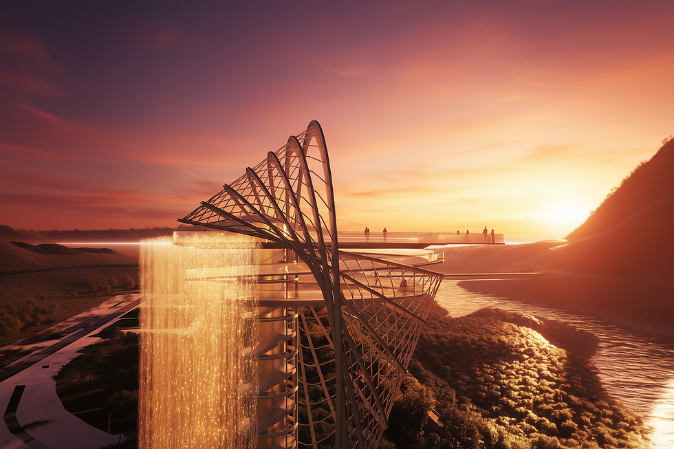 Infinity Ring은 하늘을 상징하는 수평 링과 물의 낙하를 상징하는 수직 링이 결합된 전망대 조형물이다. 정면에서는 하늘 원에서 물이 떨어지는 장면, 측면에서는 파장의 궤적이 드러나며, 시점에 따라 다른 풍경과 리듬을 제공한다. 두 링의 연쇄는 섬진강과 하늘이 맞닿는 구례의 자연 서사를 응축한다. 전망대로 오르는 동선은 물의 순환을 따라가는 여정으로, ‘섬진8경’ 체험을 구성하여 증발·응결·낙하 등 물의 변주를 공감각적으로 경험하게 한다. 전남 구례군 간전면 섬진강 수달생태공원 내 높이 53.5m 철골 전망대로 계획되었으며, 지리산과 섬진강의 탁월한 경관을 수용하고 관광 거점으로 기능한다. 야간에는 링 구조, 워터폴, 코어를 중심으로 LED 라이트 서클·워터폴 투사 조명·스파이럴 라이트가 어우러져 낮과는 또 다른 빛의 서사를 창출한다.