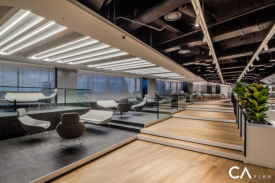 7층 로비는 커뮤니케이션의 중심이 되는 공간으로, 인포, 카페, 라운지, 라이브러리, 회의실, 교육장 등이 복합적으로 구성된 하이브리드 플레이스다. 벽체 대신 바닥의 레벨 차이를 활용해 물리적 경계 없이 시각적으로 열린 공간을 구성했고, 인포와 카페는 접근성을 고려해 그라운드 레벨에, 라이브러리와 프라이빗 라운지는 약 50cm 높은 단차를 두어 공간을 분리했다.