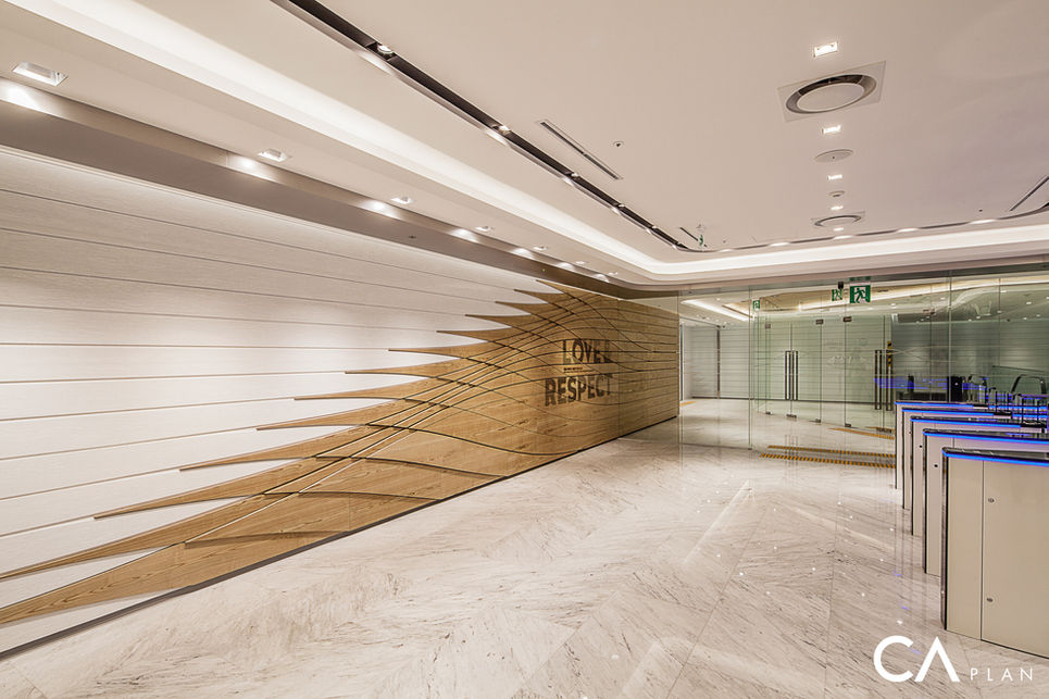 Mapo Aekyung Town is Aekyung Group’s first complex headquarters, shared by multiple affiliates and combining office, retail, and hotel functions. The design scope included shared spaces like the lobby, corridors, and VIP floors. Inspired by the lighting motif from Aekyung Forest, the “AK pattern” was algorithmically designed as a dynamic identity that adapts to various spaces.