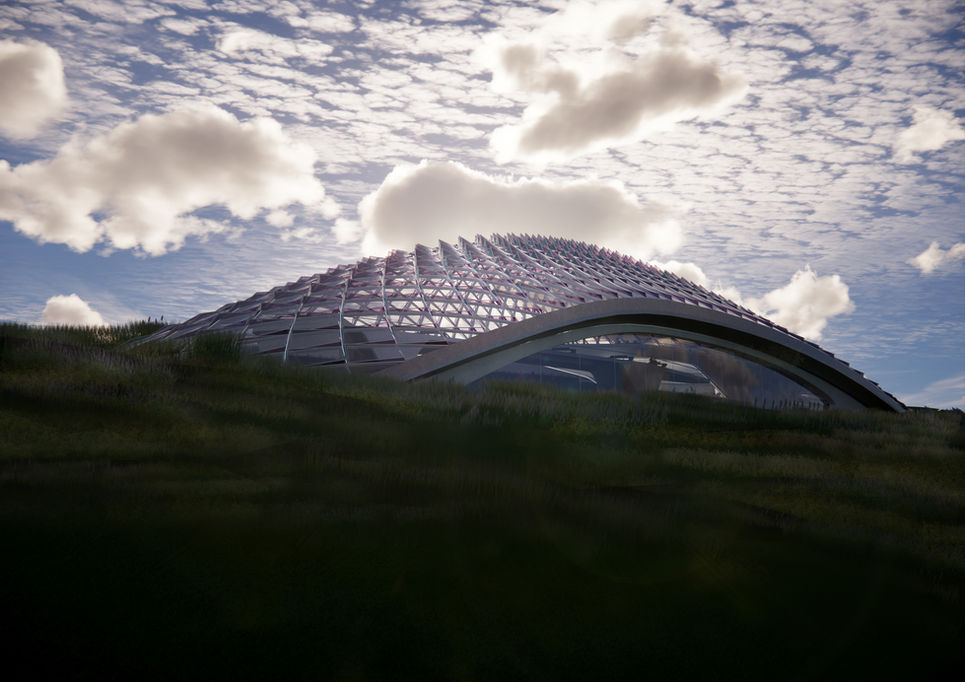 The facade, inspired by dragon scales, uses ETFE material for the exterior windows, reflecting greenhouse functionality. The translucent exterior filters natural light, offering dynamic views that change with the visitor's position and the time of day.